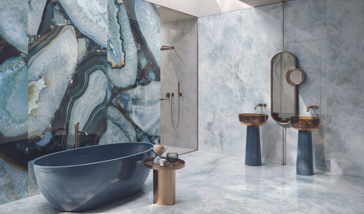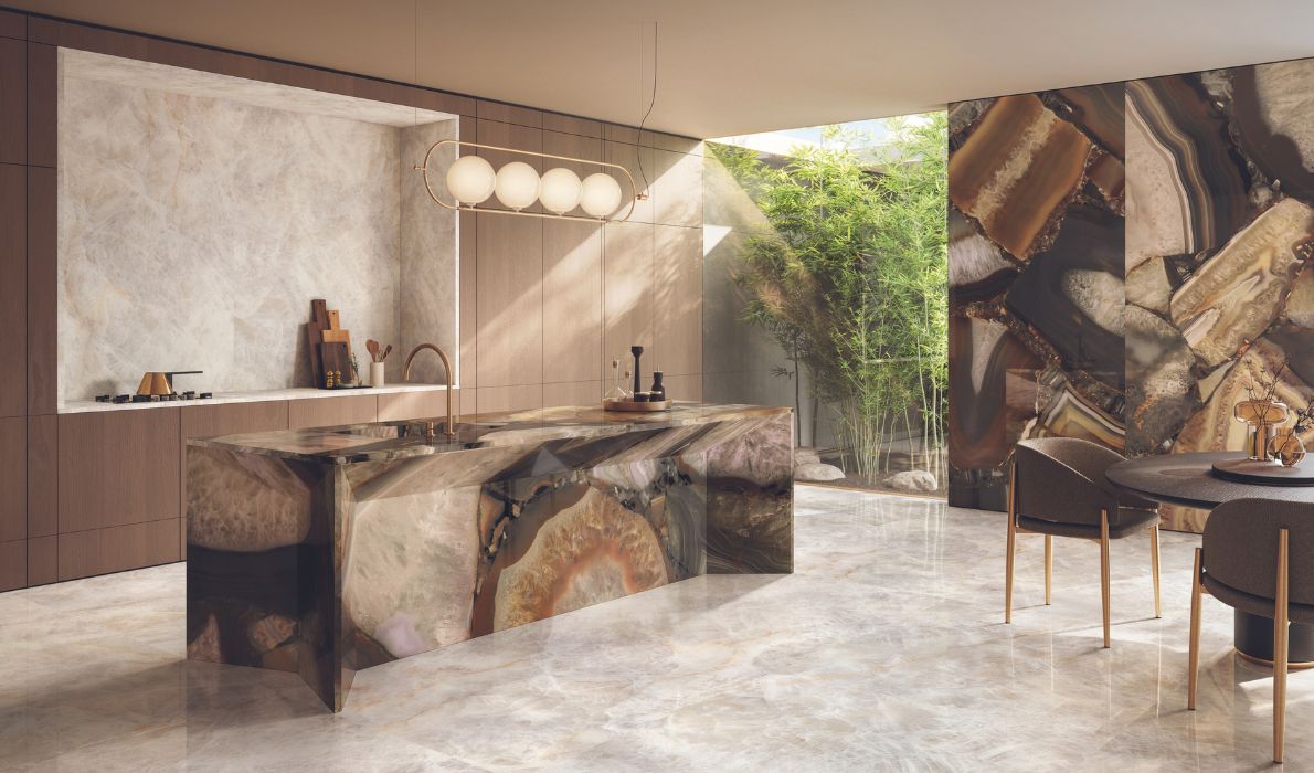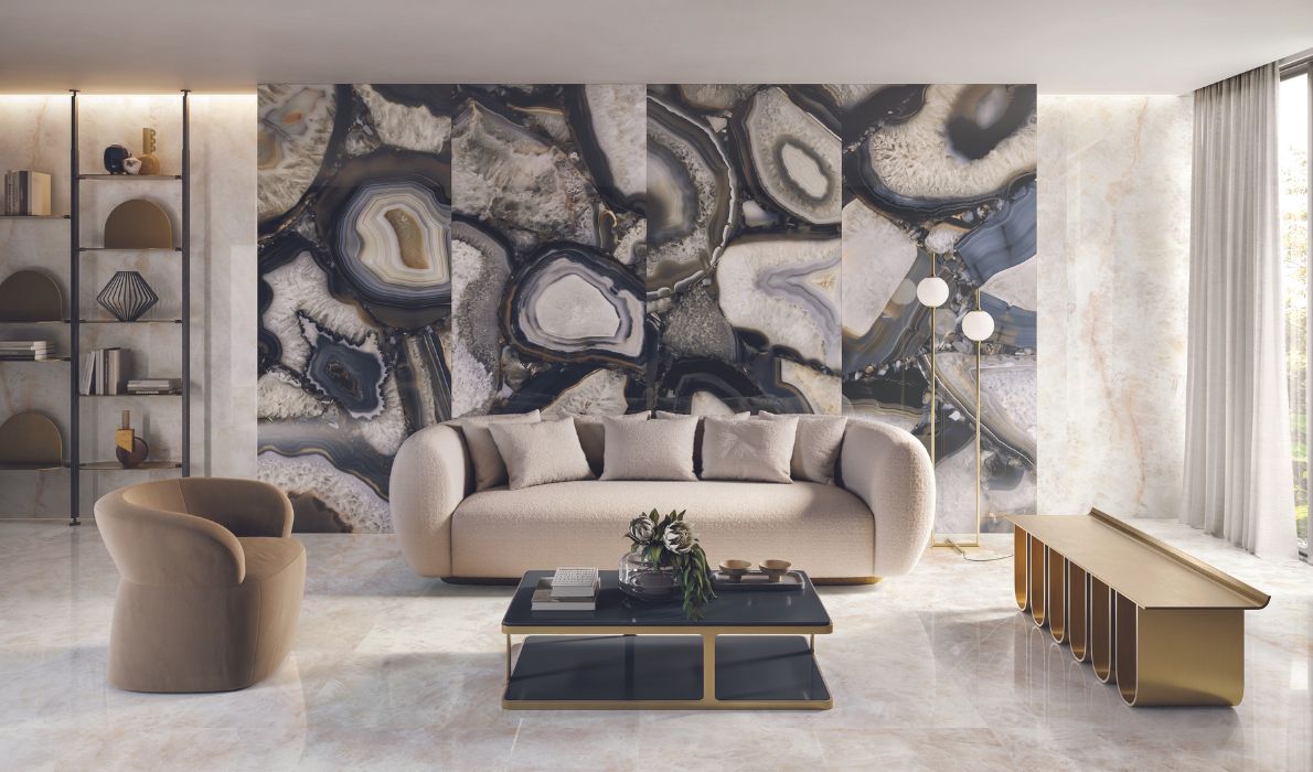 The giant proportions Emilceramica chooses for its reinterpretation of quartz achieves a striking effect for agate, in three colour variants. Agate’s distinctive circular formations are broken down on a background of chiaroscuro effects pushed to their limits, run through with subtly emerging warmer or colder colours, to produce a complex graphic pattern that dialogues with the plain tiles through vague colour matching and a shared crystalline structure. Magnified in both its size and its aesthetic, quartz dominates the design of living spaces with the massive size of its slimline large slabs, made even more exquisite by the glossy mirror finish of the ceramic surface.